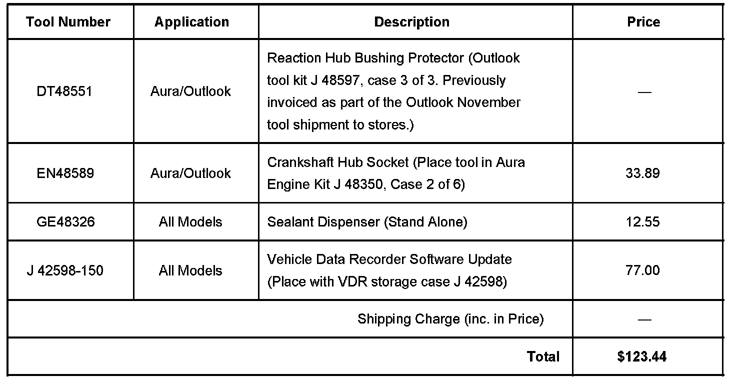 During the week of December 25, 2006, Kent-Moore will be sending out a special tool update to all Saturn service facilities. The following is a description of what is being sent to you, along with the associated cost. Shipping charges have been included in the cost of each tool.
