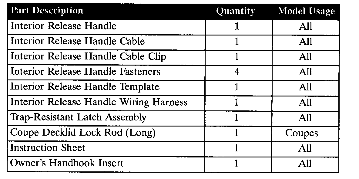The Trap-Resistant Latch that is part of this kit does not have the valet feature of the existing 2000 model year latch. Please inform the customer prior to kit installation that the "SECURE TRUNK" feature of 2000 model year vehicles will not work any longer with the Trap-Resistant Trunk Kit installed.