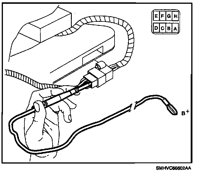 2. Start engine and turn On A/C and verify that compressor clutch engages. With clutch engaged, apply battery voltage to the test adapter installed in step 1 above.