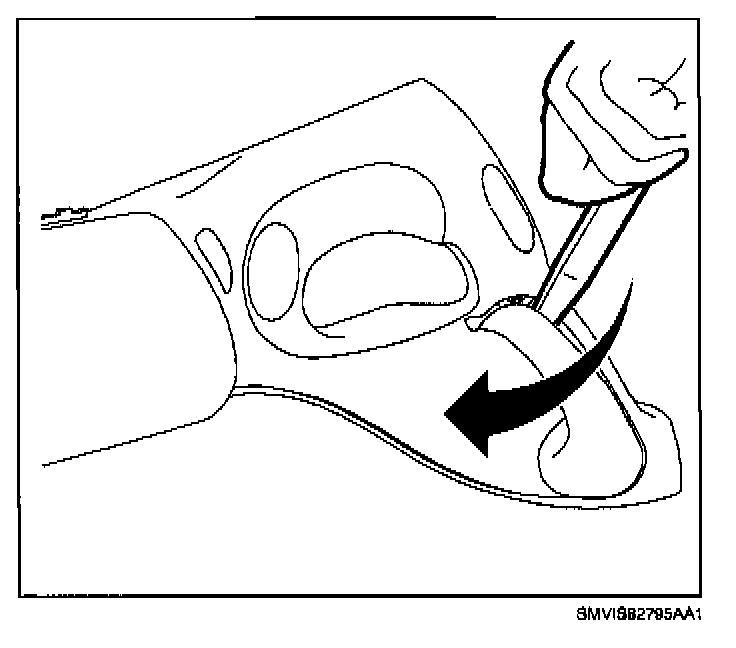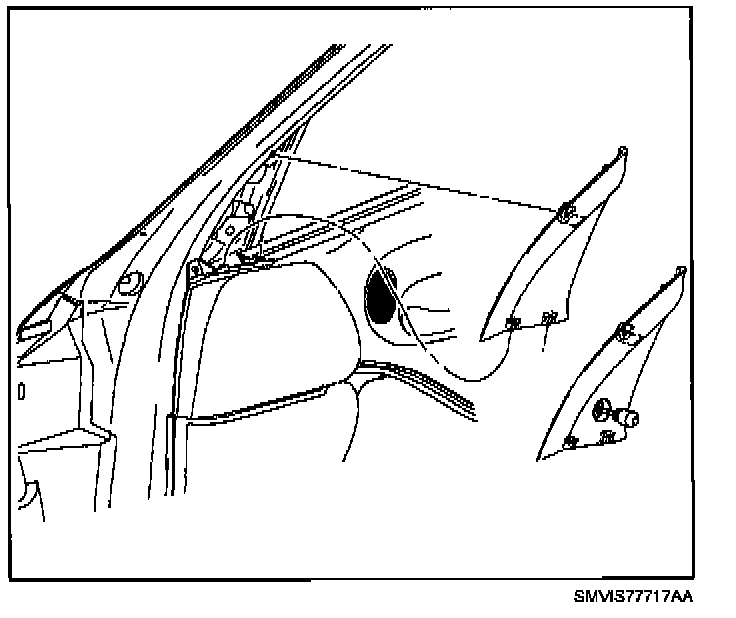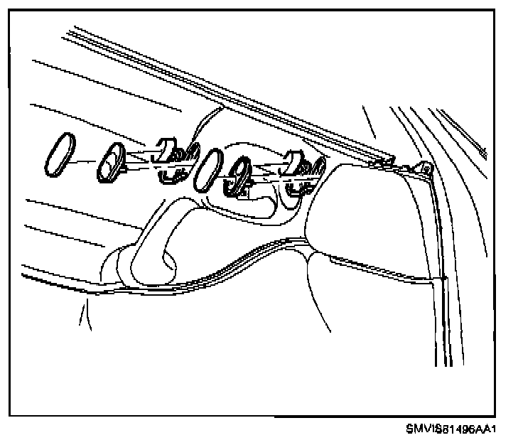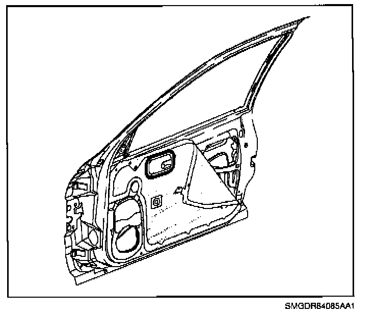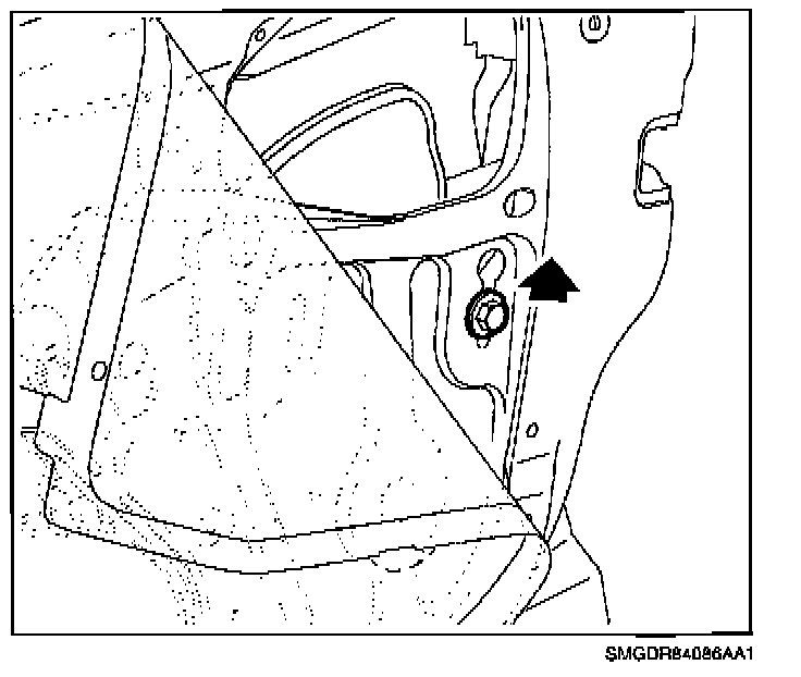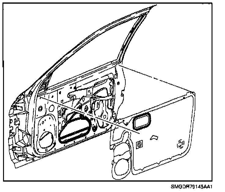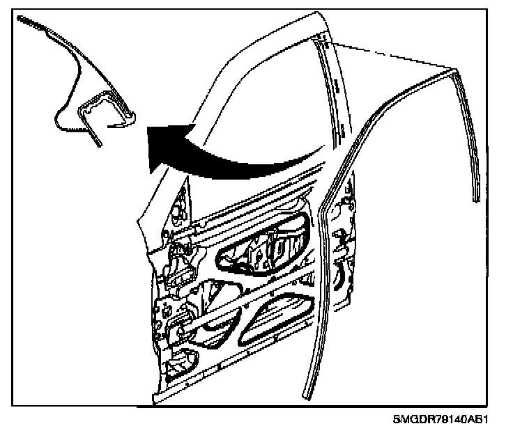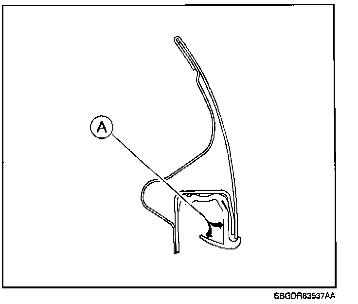 20. Apply a 1 mm (0.04 in.) bead of lubricant along entire vertical length of weather strip (at location [A] as shown) between belt line and top of door.