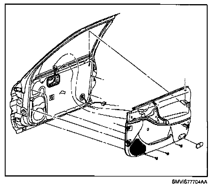 23. Remove water deflector from upper corner of door structure far enough to allow access to rear most window regulator attachment bolts.