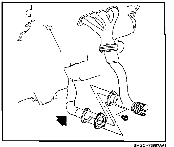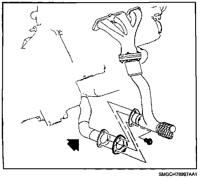 7. Remove front exhaust manifold pipe to rear exhaust manifold pipe attachment bolts.