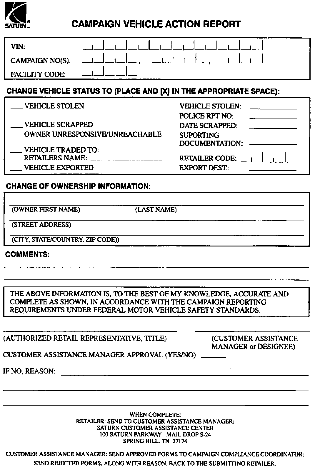 ^ Submit a Campaign Vehicle Action Report to your Customer Assistance Manager (CAM) at the Saturn Customer Assistance Center; OR