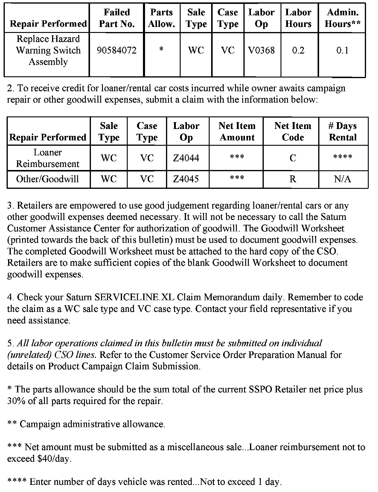 Complete this worksheet and attach it to the hard copy of the Customer Service Order (CSO) to document all campaign goodwill claims submitted to Saturn.