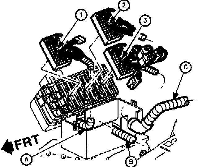 6. Release retaining tabs (2) on underhood fuse block and roll fuse block back (1) to access electrical connectors.