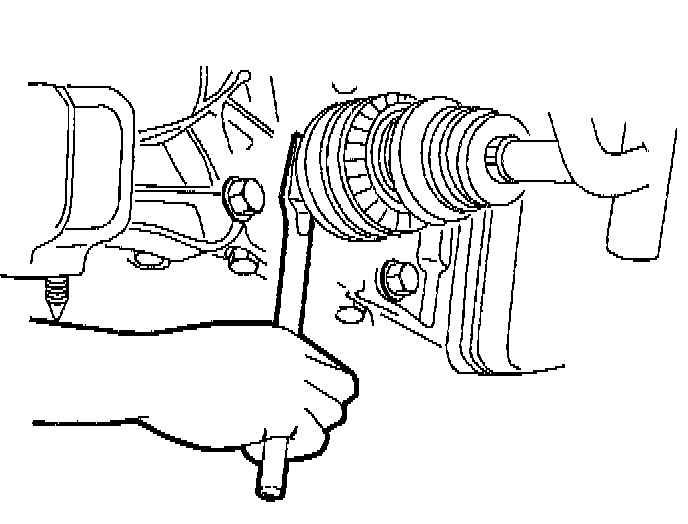 25. Use a pry bar to remove axle shafts from transaxle. Leave axle shafts in steering knuckles and secure axle shafts up and out of way of transaxle removal path.