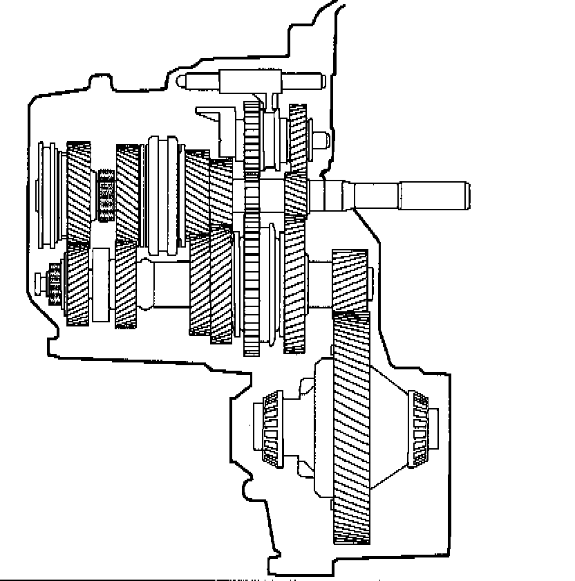 5th Gear: In 5th gear range, 1st/2nd and 3rd/4th synchronizers are in a neutral position and the 5th speed synchronizer sleeve is moved to the right to engage 5th gear blocking ring and 5th gear. With 5th gear synchronizer hub splined to input shaft, torque is transmitted from input shaft through synchronizer hub and sleeve, 5th drive gear, 5th driven gear, output shaft, and into the differential (final drive) assembly.