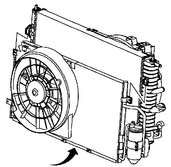 NOTE: Condenser block must be engaged to radiator end tank bracket before sliding condenser upward.