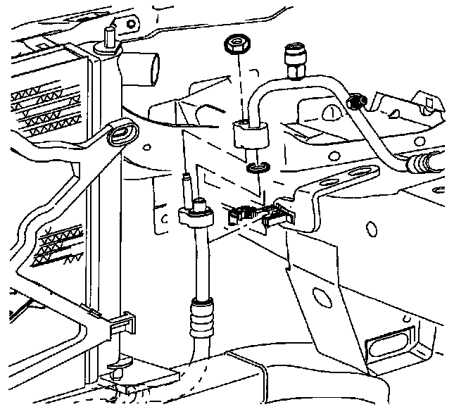 8. Install condenser block-to-radiator end tank bolt.