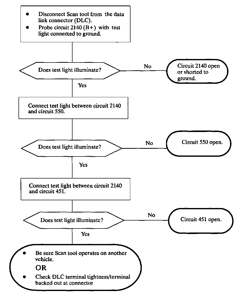 Most Scan tools use the power and ground circuits at the DLC. This chart does not diagnose the Scan tool, only the vehicle. Before using this chart be sure that the Scan tool operates properly on another vehicle.