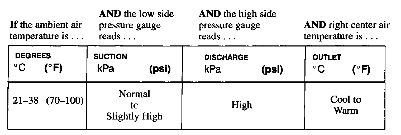 ^ An overcharged condition will generate a poor and/or intermittent cooling complaint at higher ambient air temperatures. Intermittent complaints are caused by the pressure switch cycling the compressor On and Off.