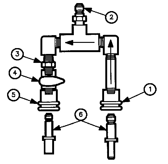 It is connected with the inlet side (1) to the fuel feed, the outlet (5) to fuel return (or drain), and the gauge port (2) to the pressure gauge or cap. The ON/OFF control valve (4) provides a means to control fuel flow for pressure and leakdown testing.