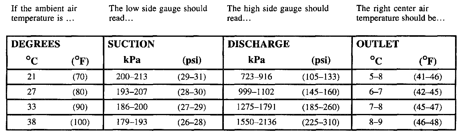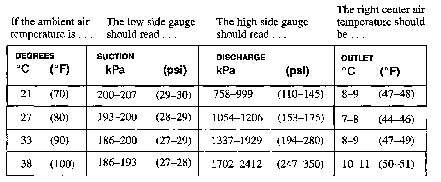 14. Record A/C system pressures and outlet temperature every minute for five minutes.