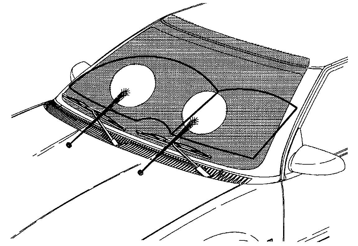 The washer nozzle spray pattern is identified in the illustration. If the nozzle is not delivering washer fluid according to the illustration, make sure that the nozzle is properly seated in the hood assembly.
