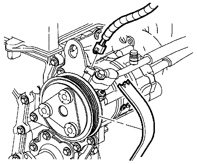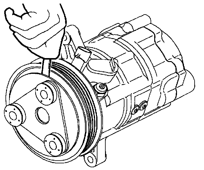 1. Remove accessory drive belt from compressor clutch pulley by rotating belt tensioner clockwise using a 14 mm or 9/16 in. wrench. Snap-On(TM) tool S8190A (or equivalent) can be used.