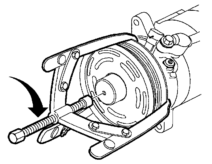 17. Install three-jaw puller on A/C compressor pulley. Tighten the center bolt to remove pulley assembly.