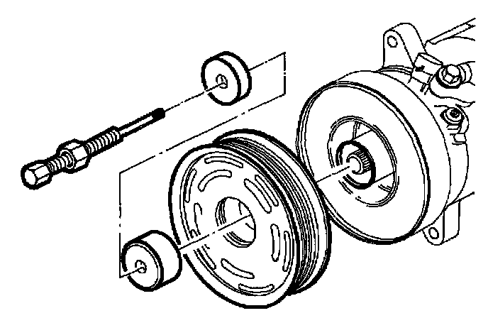 4. Finger tighten nut on installation bolt to align pulley to A/C compressor. While holding end of bolt, tighten nut until pulley bottoms out on A/C compressor.