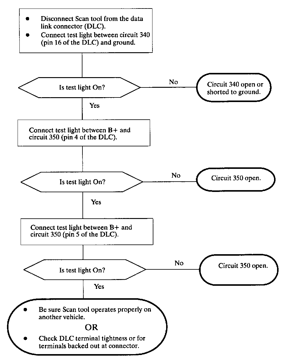 Most Scan tools use the power supply as well as the ground circuits at the DLC. This chart only diagnoses the vehicle, not the Scan tool. Before using this chart be sure that the Scan tool operates properly on another vehicle.