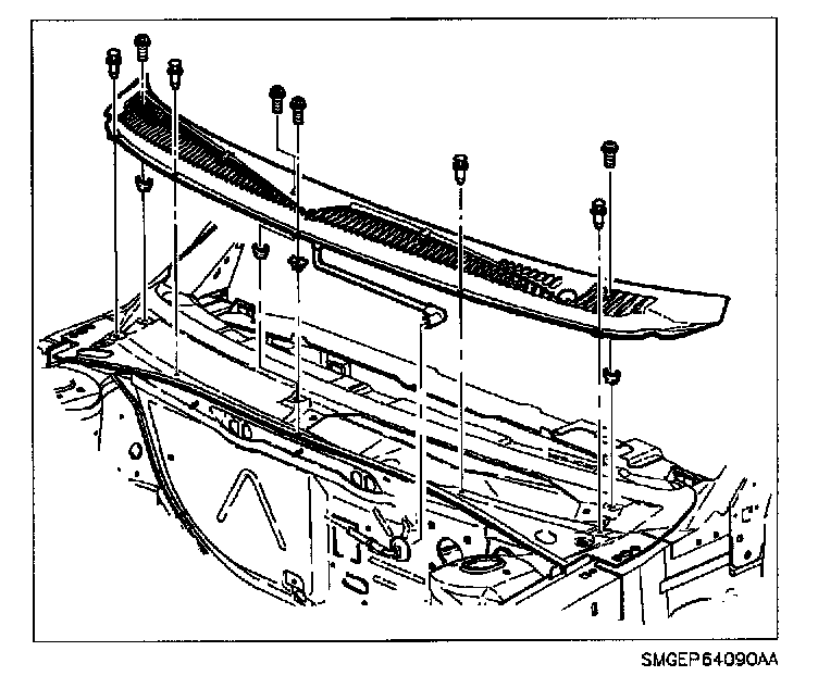 16. Install shroud top vent grille. Connect windshield washer hose.