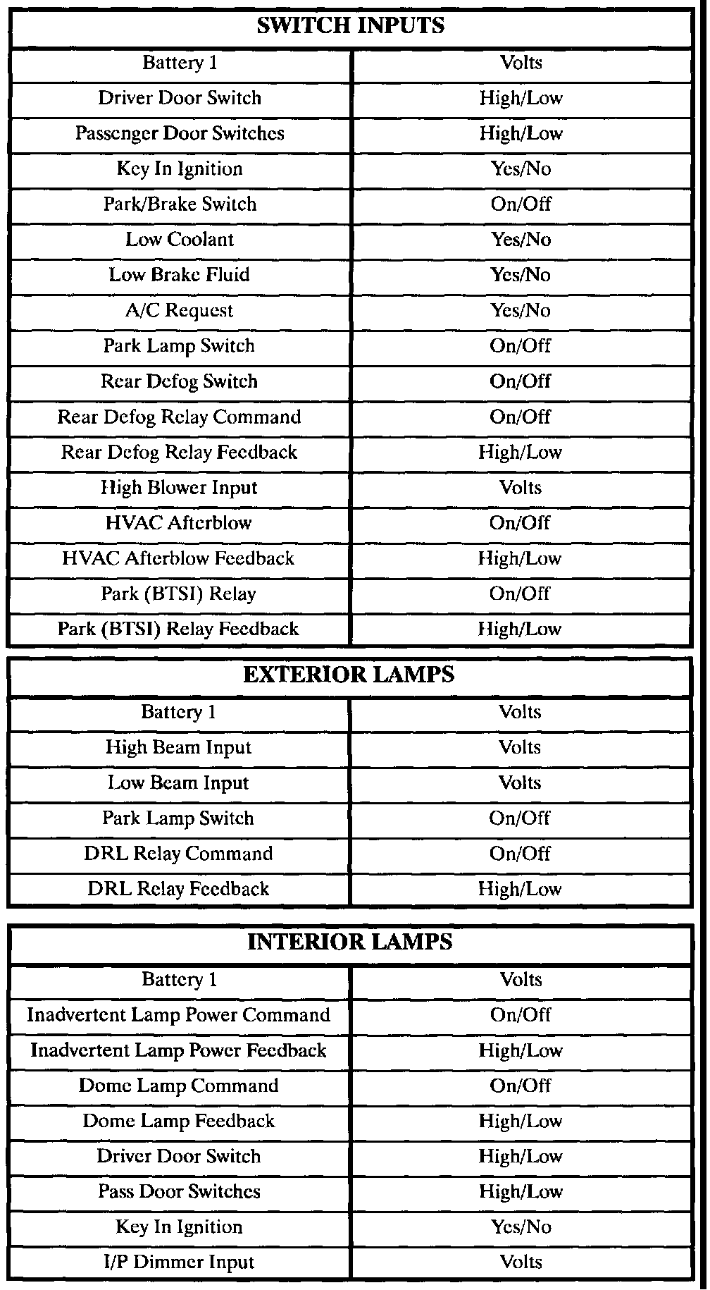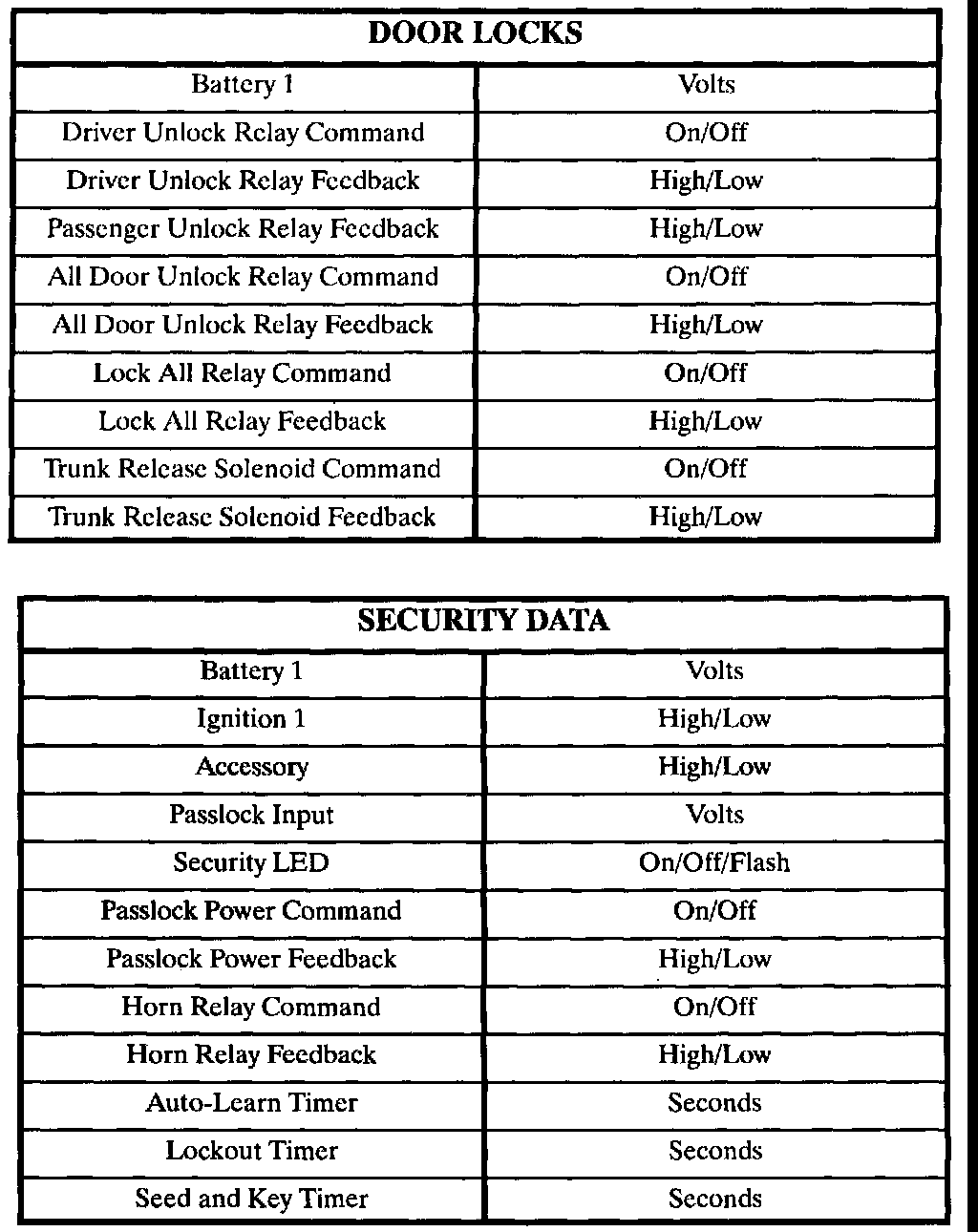 The tables lists the data directly related to the RKE/security system.