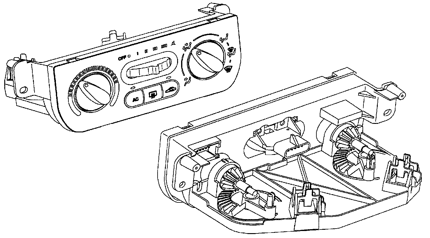 The temperature knob controls the temperature door through a cable from the HVAC control assembly to the HVAC module. The mode knob controls the various mode positions by a cable from the HVAC control to the HVAC module.