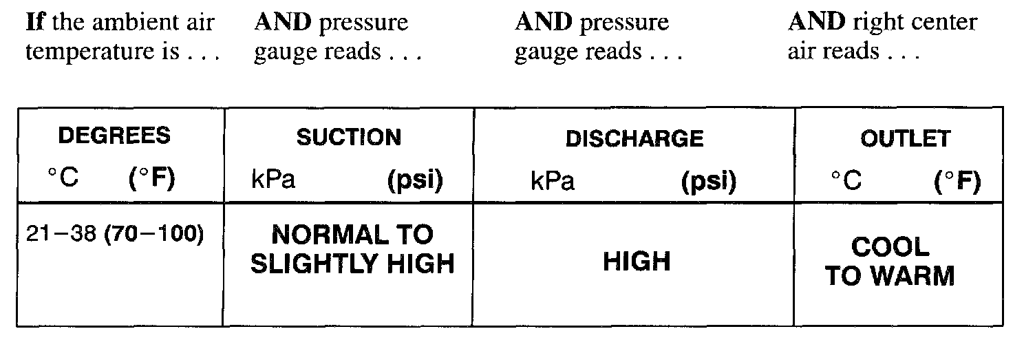 ^ An overcharged condition will generate a poor and/or intermittent cooling complaint at higher ambient air temperatures. Intermittent complaints are caused by the pressure switch cycling the compressor On and Off.