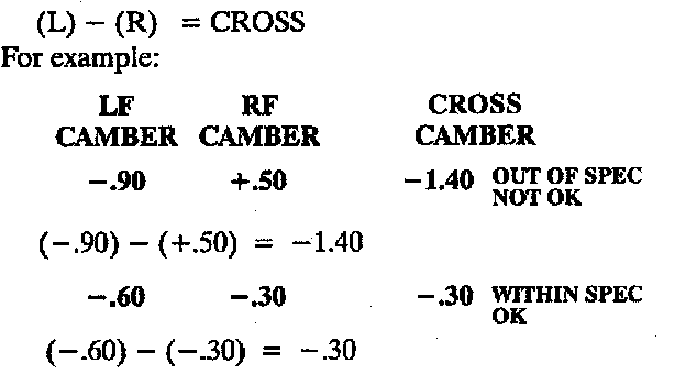 Cross camber and cross caster specifications refer to the difference between the left and right side angles. Cross camber and cross caster can influence vehicle steering pull tendencies. Usually, alignment results will be best when these measurements are as close to zero as possible.