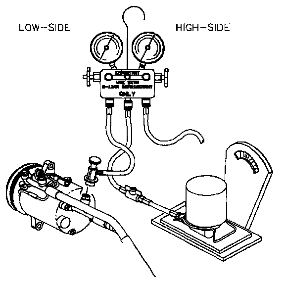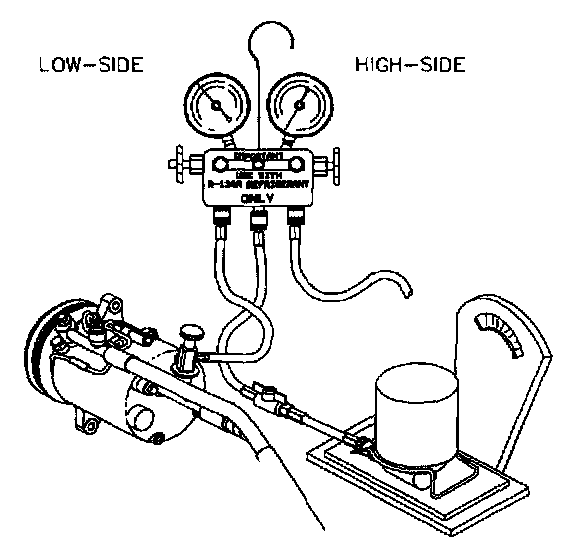 2. As soon as 0.50 kg (1 lb.) has been added to system, start engine, set the mode control to vent, temperature lever to full cold, blower speed on high, and push A/C compressor button to the On position (A/C control button light On). Slowly draw in the remainder of the refrigerant charge 0.23 kg (0.5 lb.). Total system charge is 0.68 kg (1.5 lbs.).