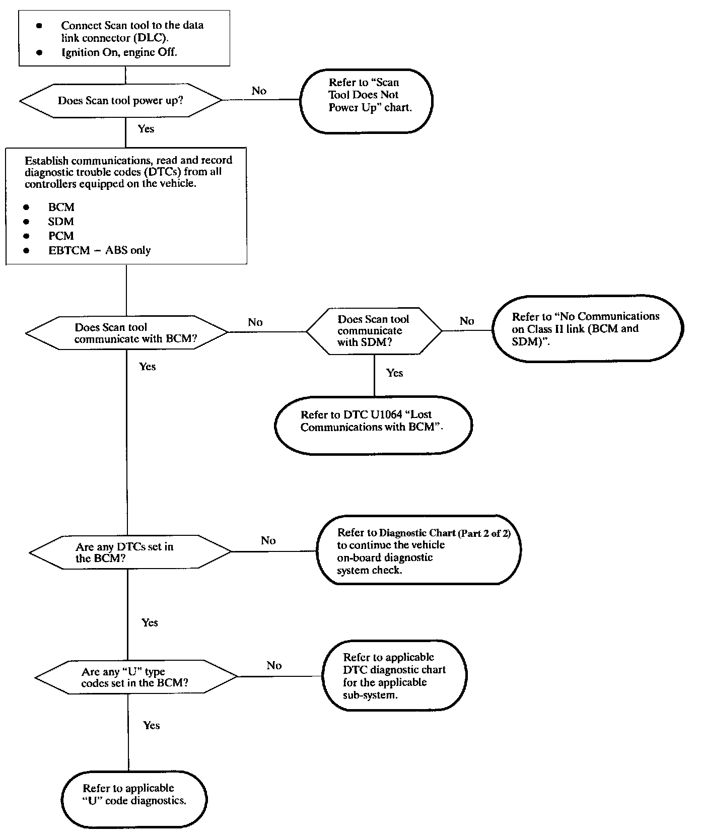 Since the BCM is the master on the Class II link and the SDM is on every vehicle, these controllers should be communicated with first since they may help to determine potential serial data link errors.