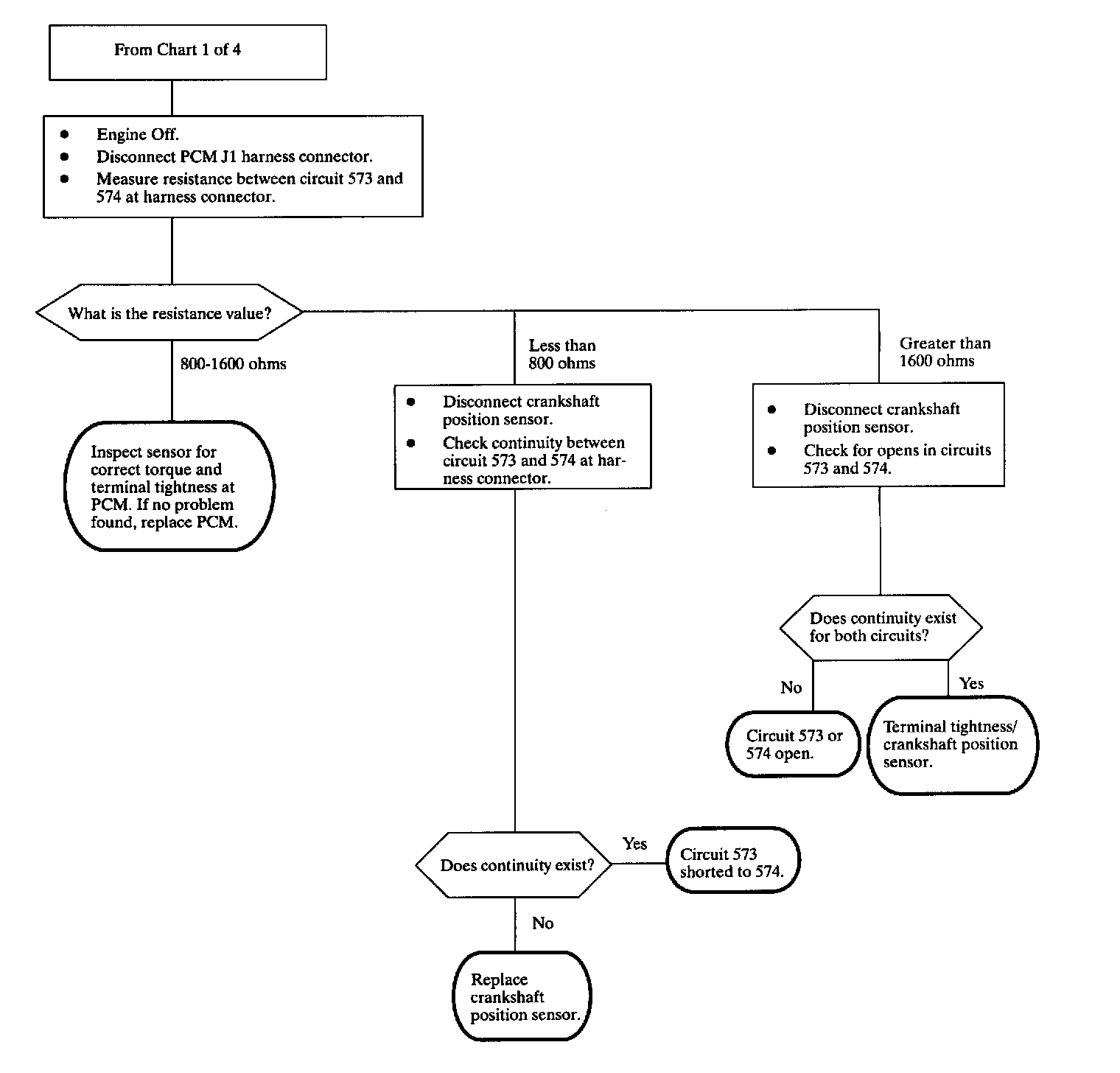 The voltage between circuit 573 and 574 measured at PCM J1 harness connector (disconnected) while the engine is cranking should be over 200 mV AC.