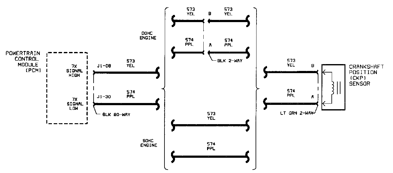 The crankshaft position (CKP) sensor produces an AC voltage of different amplitude and frequency once the crankshaft velocity exceeds 60 RPM. The crankshaft has 7 total machined notches, 6 of which are spaced 60° apart. The remaining tooth is 10° before the #4 cylinder TDC notch. This extra notch is used by the PCM to determine the position of the top dead center #4 cylinder necessary to synchronize engine position. The CKP sensor is used for fuel delivery, spark timing and misfire diagnostics.