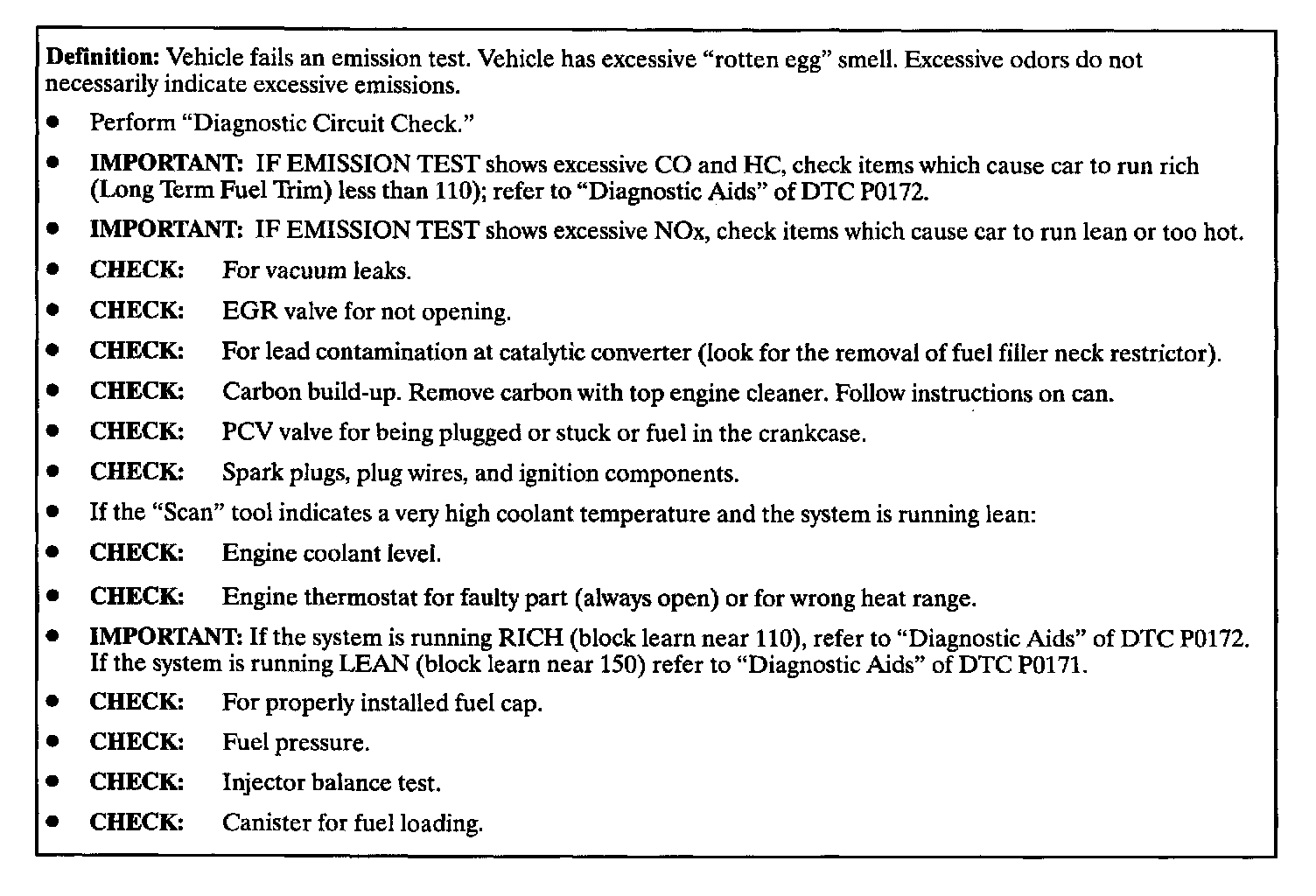 Vehicle fails an emission test or vehicle has excessive "rotten egg" smell. Excessive odors do not necessarily indicate excessive emissions.