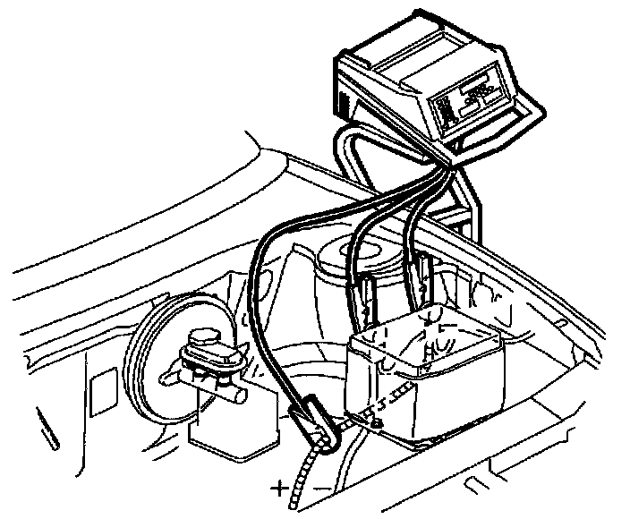 3. Place the gray inductive current pick-up around the battery positive cable between the battery positive terminal and the starter motor solenoid connection. The easiest place to connect the inductive pick-up is next to the brake master cylinder. The battery positive cable runs under the master cylinder and is covered by a protective wire conduit. This conduit does not need to be removed for this test. On vehicles equipped with ABS brakes, pick-up can be placed between the ABS master cylinder and starter motor.