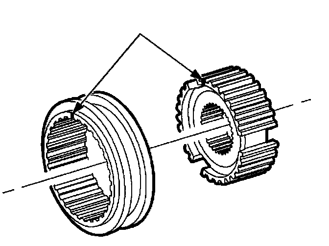 IMPORTANT: Synchronizer hub and sleeve must be kept together as a matched set. (3/4 synchronizer shown, 5th/Reverse synchronizer similar.) If alignment marks (indicated by the arrow) are not visible, put new marks on hub and sleeve before they are separated.