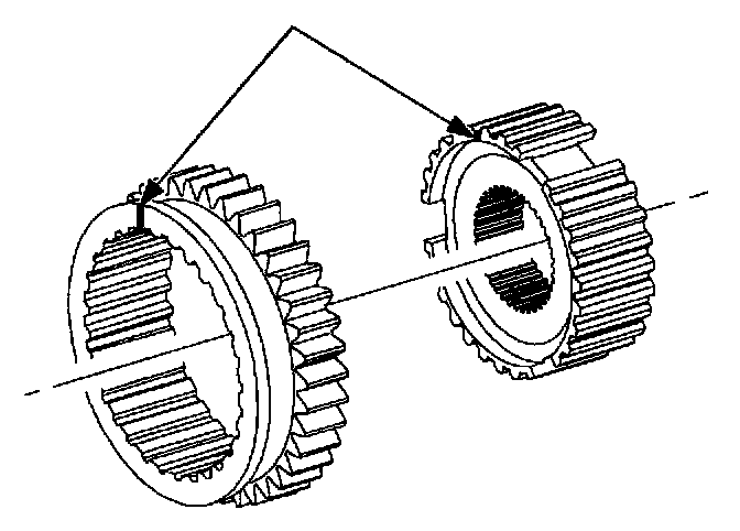 IMPORTANT: Synchronizer hub and sleeves must be kept together as a matched set. Note spline alignment marks on hub and sleeve (indicated by the arrows). If alignment marks are not visible, put new marks on hub and sleeve before they are separated.