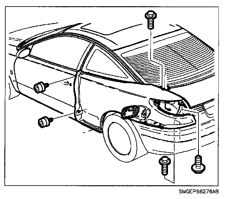 9. Remove quarter panel fasteners at lock pillar, Taillamp opening, and upper gutter area. Use lightweight wood or foam blocks to hold quarter panel out.