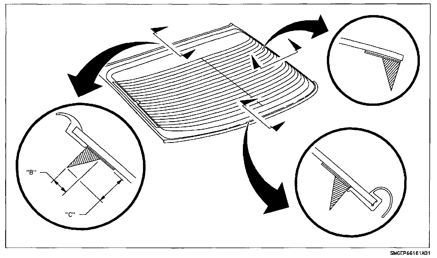 6. With aid of a helper, lift glass into window opening. Align edge of glass with notch in roof panel. Make certain the lip of the applied molding laps over the roof feature line.
