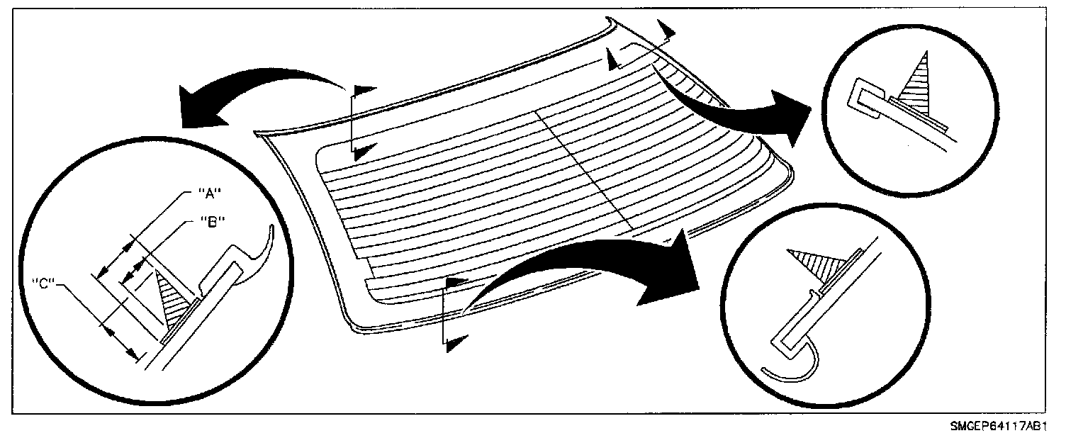 6. With aid of a helper, lift glass into window opening. Align top edge of molding with notches in roof panel. Make certain the lip of the applied molding laps over the roof feature line.