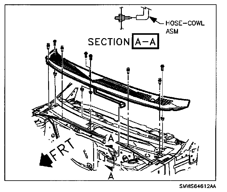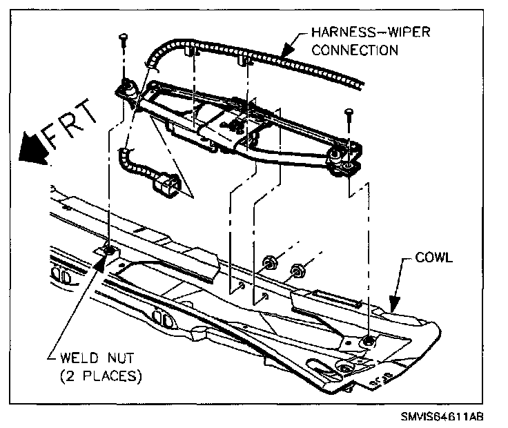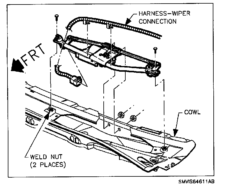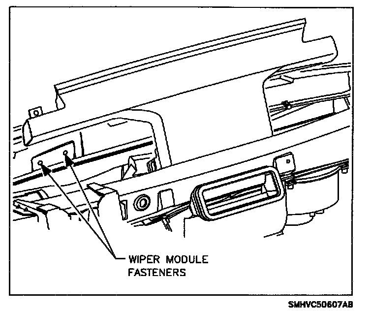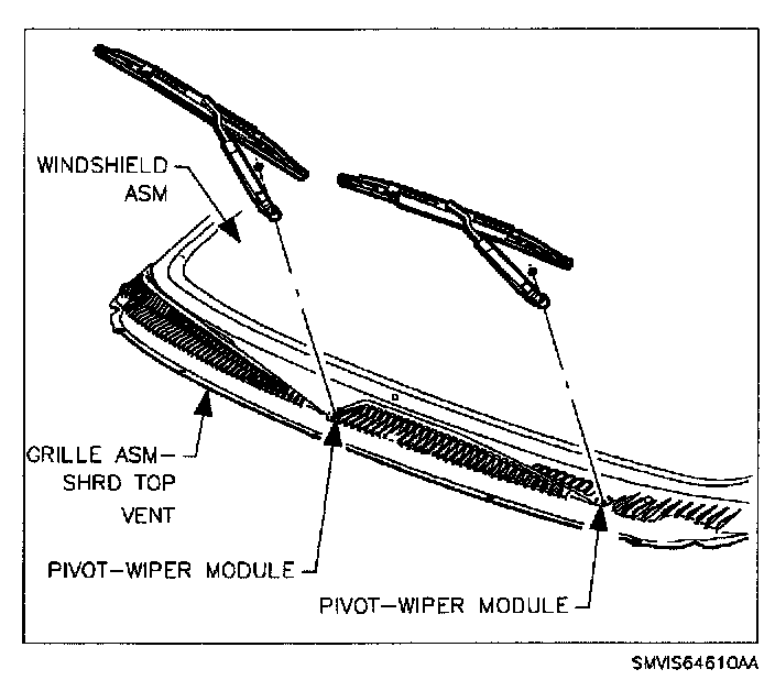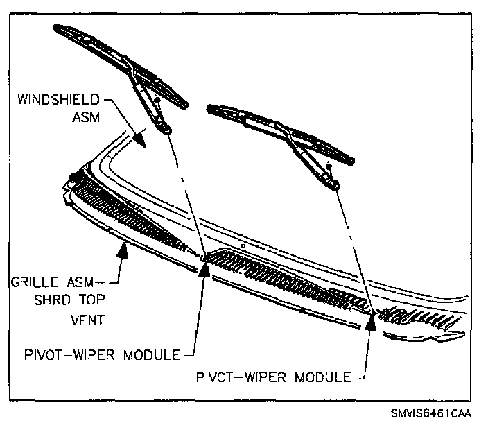 NOTE: Use care when removing wiper module from cowl to avoid pivots contacting windshield and to keep from scratching windshield.