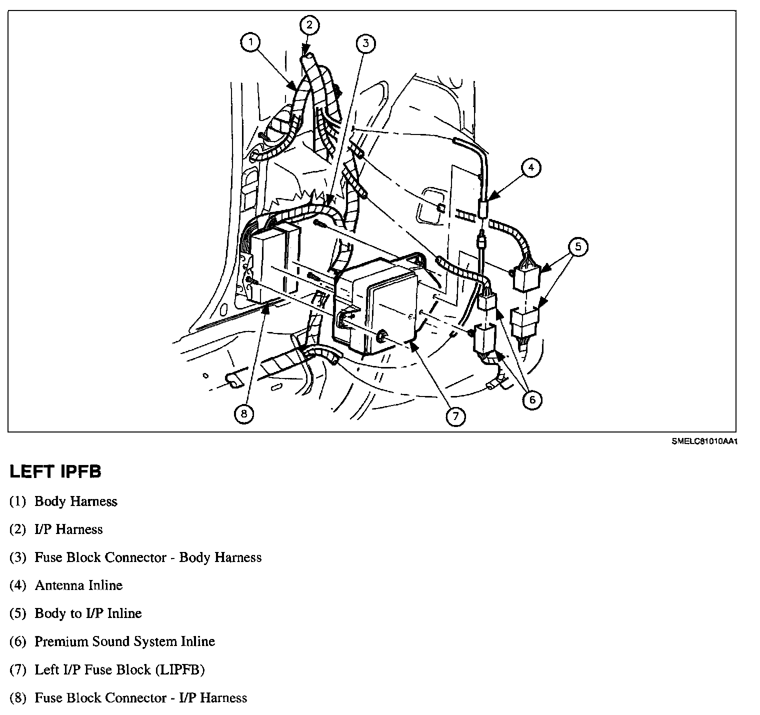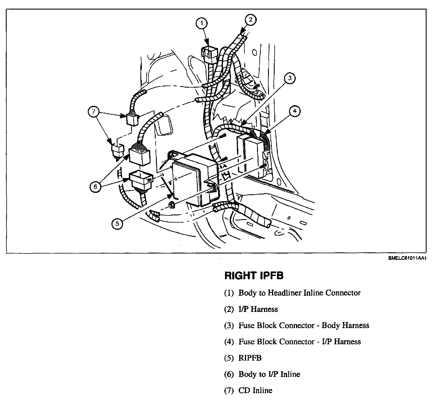 4. Remove inlines that are attached to the fuse block bracket with rose buds. (Left I/P fuse block-body to I/P inline and premium sound system inline. Right I/P fuse block-body to IP inline and CD inline.)