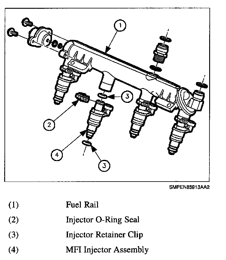 The fuel rail assembly is mounted to the cylinder head and performs several functions. It positions the fuel injectors in the intake manifold, distributes fuel evenly to the fuel injectors, and dampens fuel pump pressure pulsations. Whenever performing any service on the fuel injectors, it is essential to re-attach the fuel injectors to the fuel rail (using injector retaining clip) prior to installing the injectors into the intake manifold.