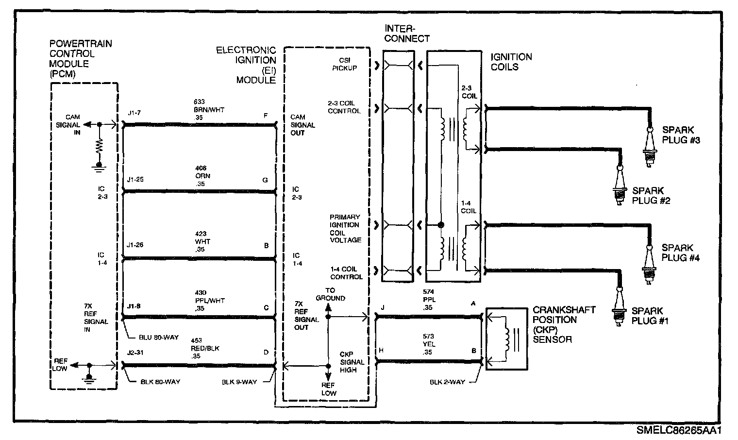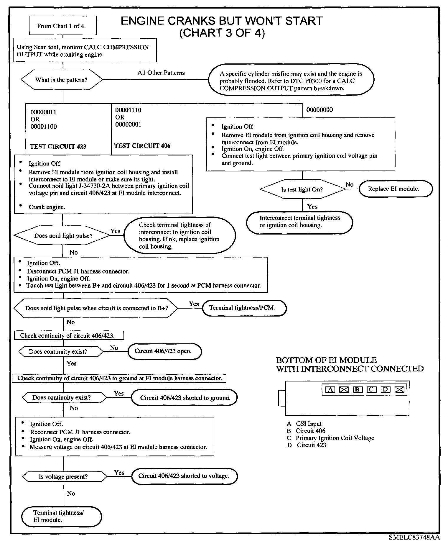 Ignition voltage is supplied to the EI module and passed through the interconnect to the coils. If this circuit is open at the interconnect, neither coil will fire. ENGINE SPEED will indicate correctly, but CALC. COMPRESSION OUTPUT on Scan tool will remain at 00000000 when the engine is cranking.