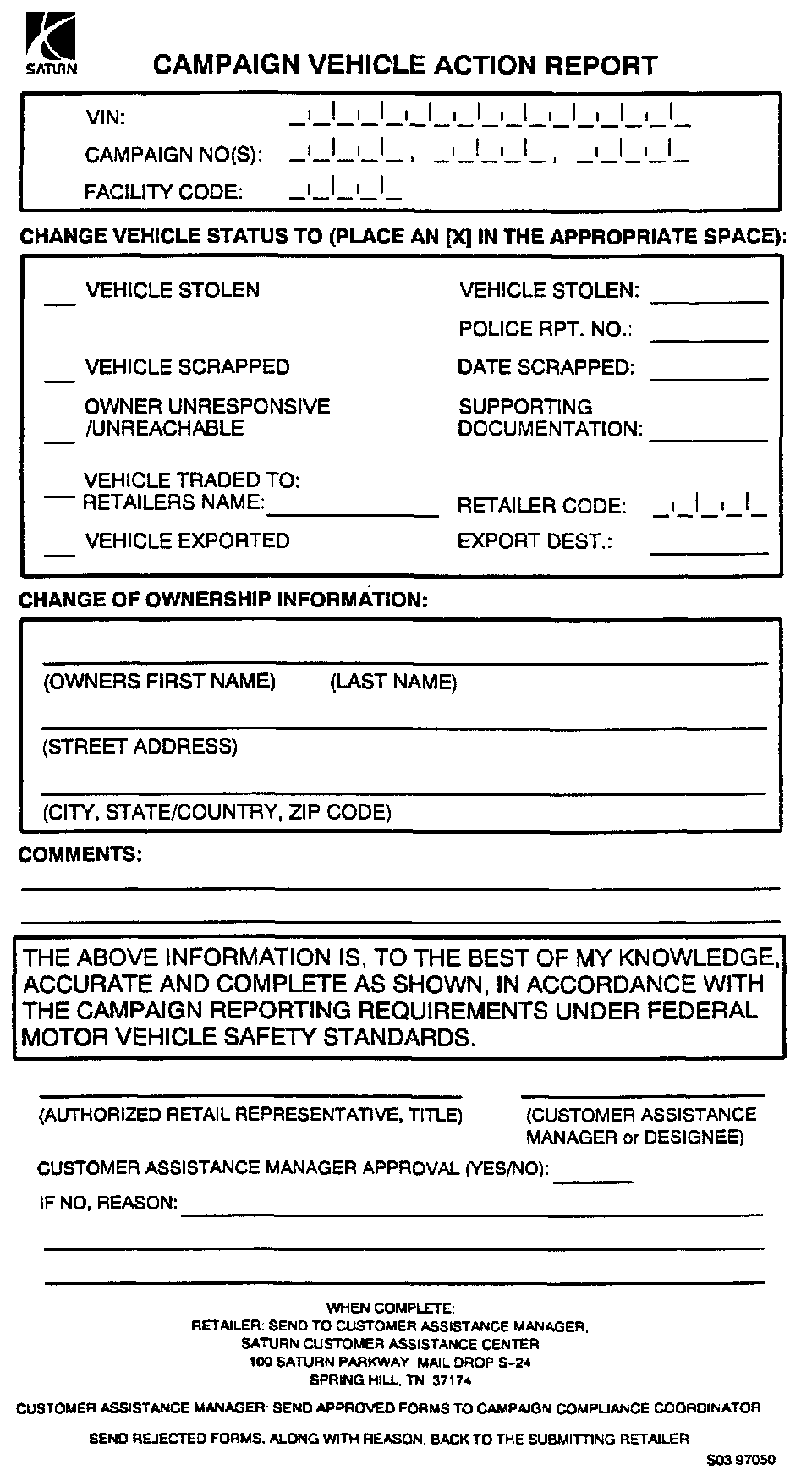 ^ Submit a Campaign Vehicle Action Report to your Customer Assistance Manager (CAM) at the Saturn Customer Assistance Center.