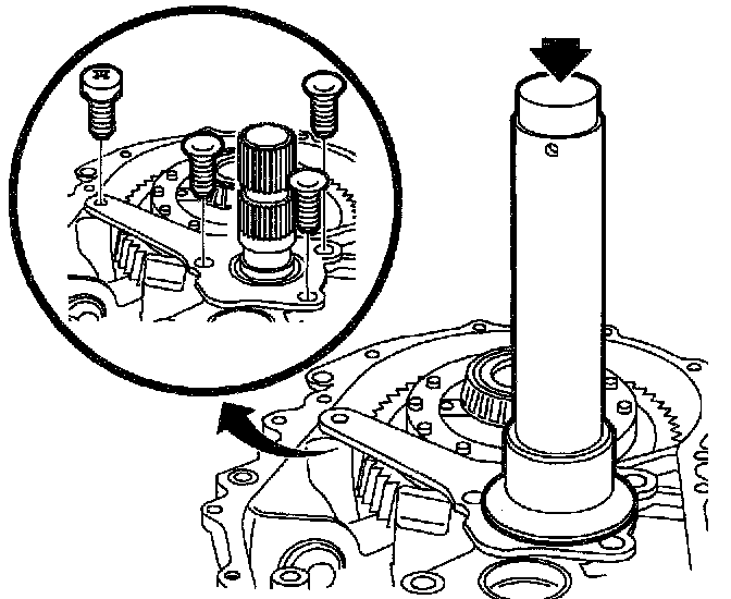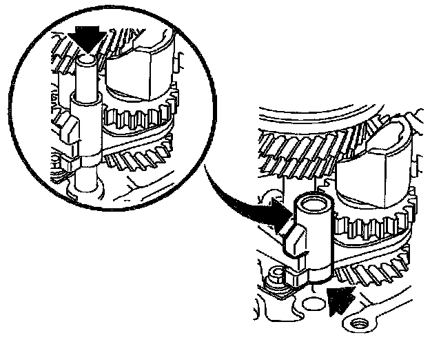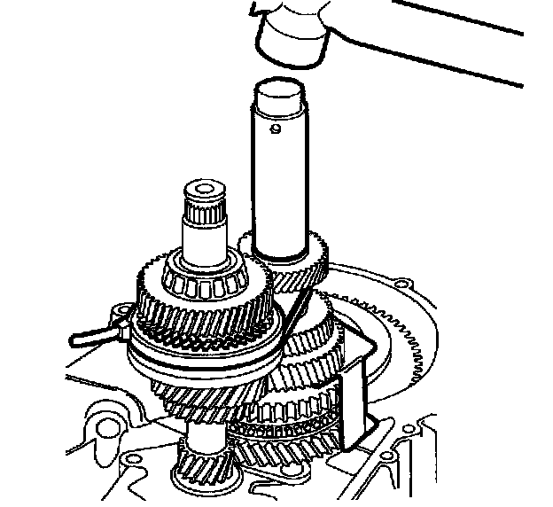 47. Engage 1st gear on transaxle and engage 5th gear by pressing down 5th gear synchronizer sleeve.