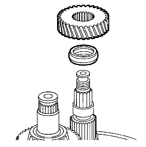 34. Lubricate and install 5th drive gear bearing, 5th drive gear, 5th gear blocking ring, and blocking ring spring.