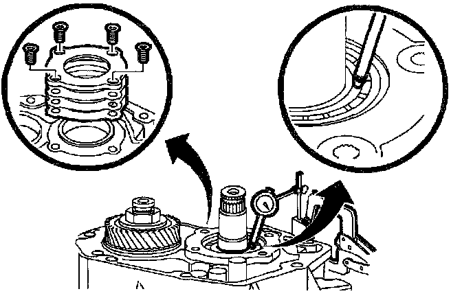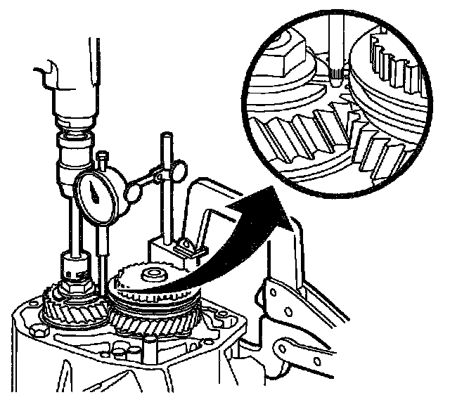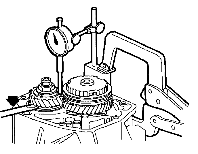 ^ If a dial indicator with a magnetic base is used, it will not work with an aluminum case. Locking C-clamp pliers can be used to hold indicator base to transaxle case.