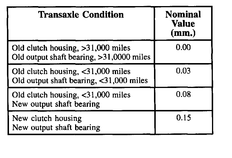 41. Place 10 Kilogram Weight 87-92-095 on top of differential bearing retainer. Install Companion Flange 87-92-053 on output shaft. Use a drill to rotate differential at least 20 revolutions. Use a feeler gauge and measure between transaxle case and differential bearing retainer in three different places. Take the average of three readings and adjust shims so that average measurement corresponds to readings in the following table.
