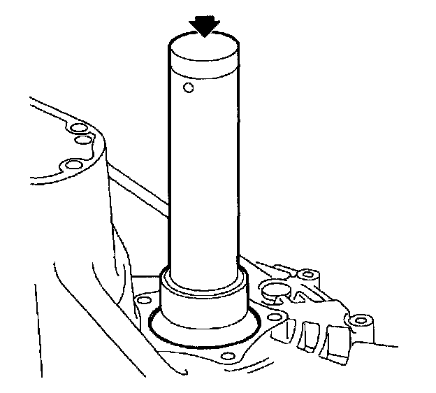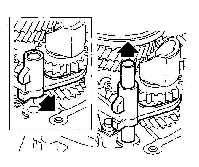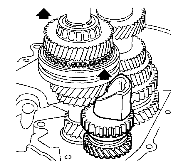 11. Engage 5th gear by pressing synchronizer sleeve and fork down onto 5th gear. Two gears must be engaged at the same time to allow removal of output shaft nut.