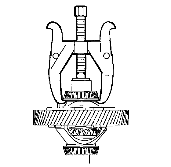 2. Remove differential bearings using puller SA9211T-2 with adapter SA9211T-4. Use Differential Bearing Support 87-92-210 as a base for the puller as shown.