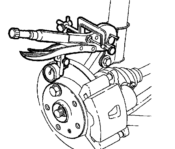 2. Fasten a dial indicator to steering knuckle so that the indictor plunger contacts the rotor about 10 mm (0.40 inch) from the rotor edge.